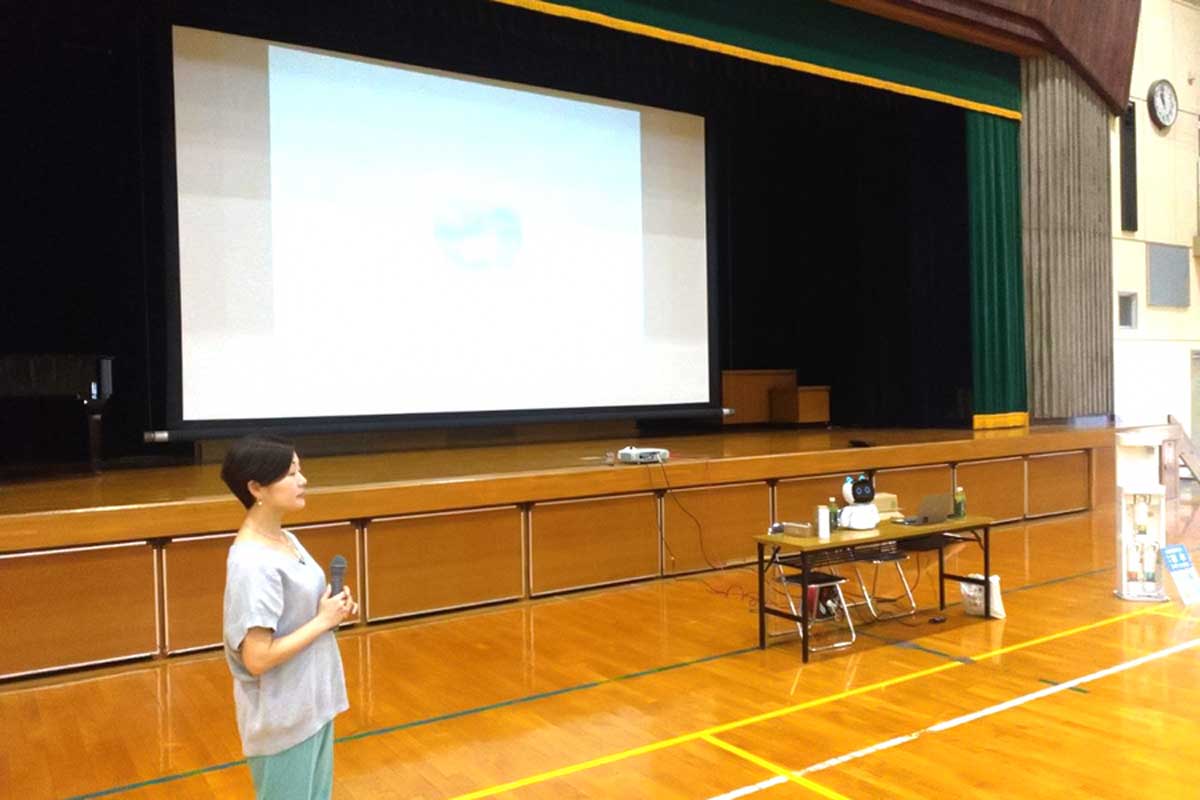AIロボットがプラスチックによる環境汚染の問題などについて、クイズを交えながらわかりやすく解説しました。また、今治市の方からも、市の環境保全に向けたプラスチックごみ削減の取り組みについてお話いただきました。