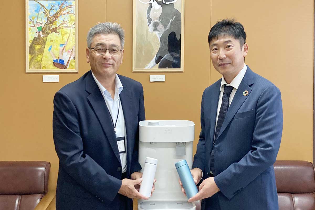 (左より)阿見町教育委員会教育長 宮﨑 智彦様、ウォータースタンド株式会社関東第2支社長 長井 康之