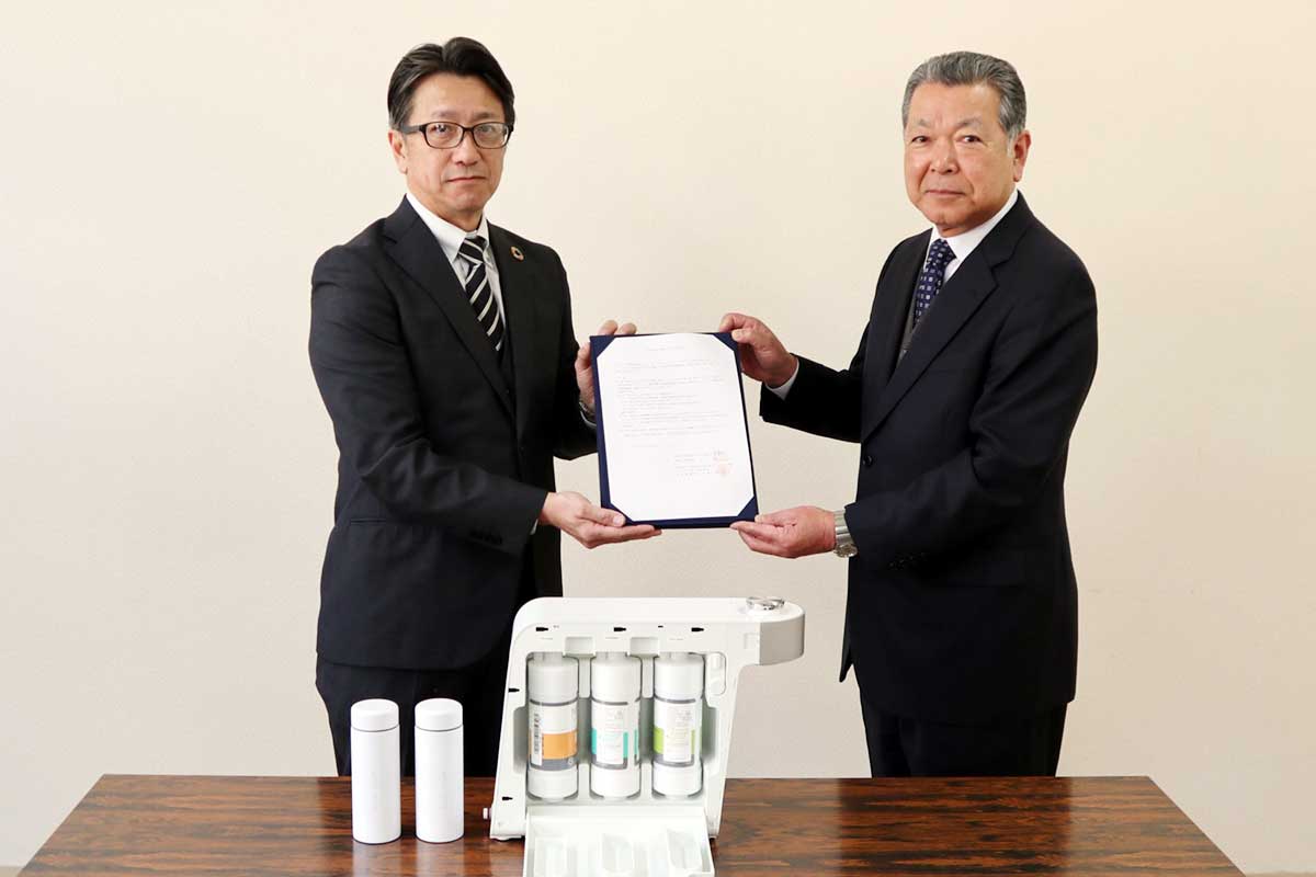 (右より)東みよし町教育委員会 教育長 天竹 勉様、ウォータースタンド株式会社取締役関西第2支社長 丸山 清治